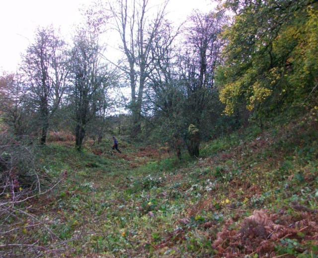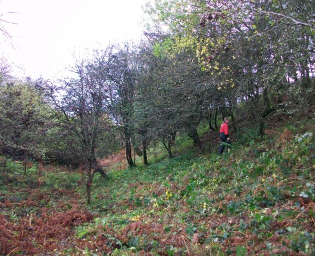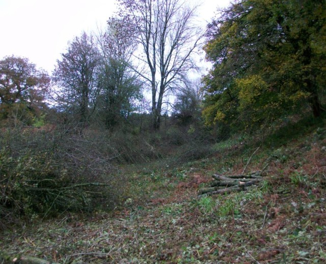 I am helping, along with other volunteers, to clear the dense overgrowth of Hawthorne, Blackthorn, Bracken, Nettle & Brambles that have grown up on the side of the south facing rampart and in the ditch below over the last couple of decades. We began work in October 2015 and we will cease work here before the end of March 2016 when the birds start nesting. This task can only be undertaken between those winter months, so we will resume the task in October 2016. We started work at the eastern end of the Hill Fort and have already cleared a considerable amount of the rampart as can be seen from the photographs of the brash that is piled up at the rampart ditch. Some of the younger trees will also be felled typically Ash, Hazel and Holly, but the selection of which trees to fell will be dependant upon the impact that removal will have on the structure of the rampart. Some trees will be retained because they are veteran trees that support priority listed invertebrates. It has been estimated that it will take us about five years to get the job done, so there’ll be more about this in the future.